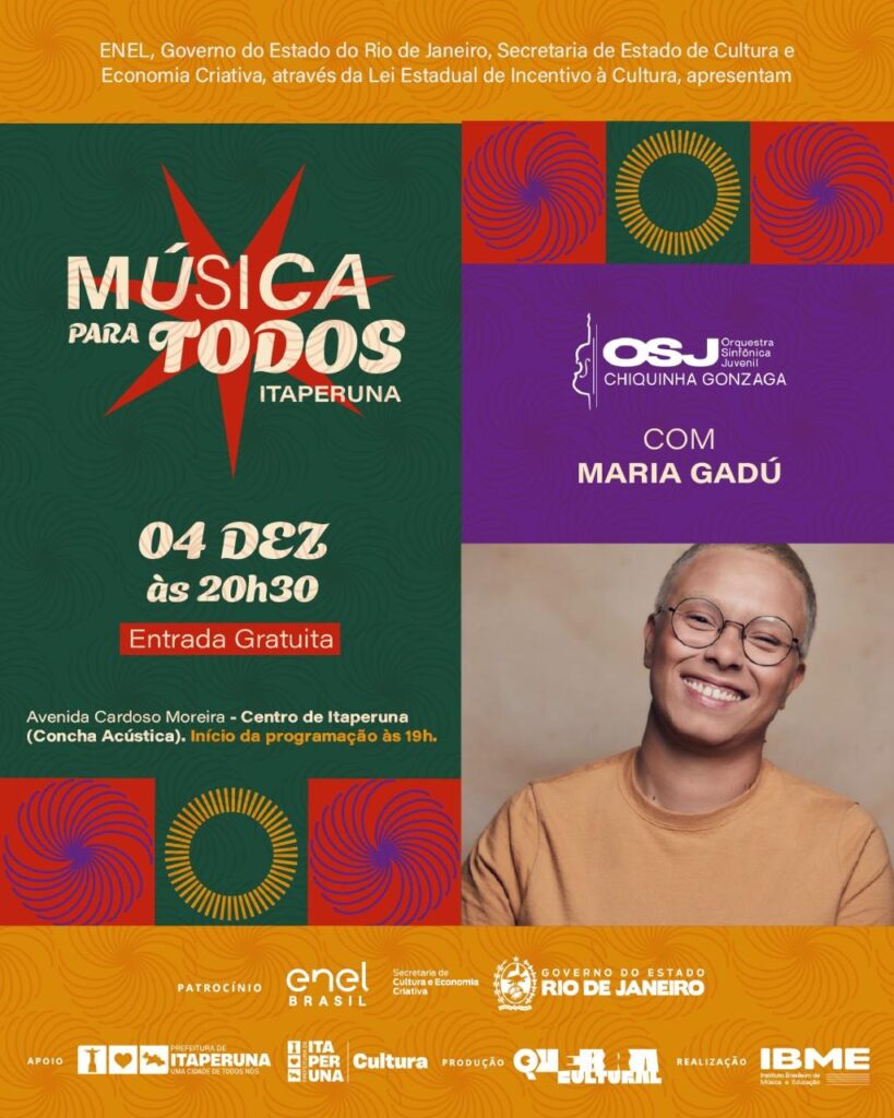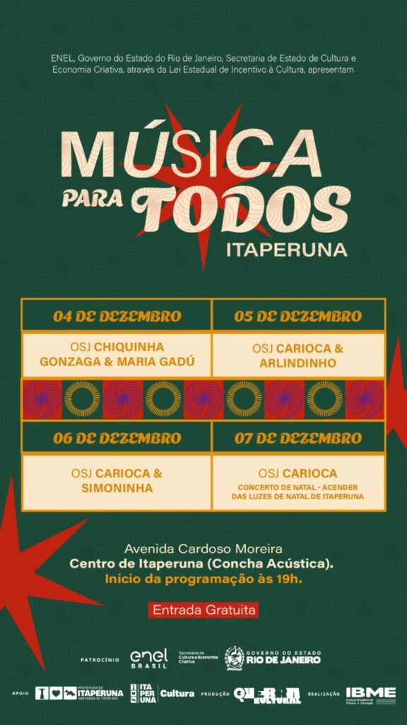O evento terá participação de nomes como o da cantora Maria Gadú, de Arlindinho, filho de Arlindo Cruz, Simoninha e um incrível especial de Natal. A programação começa na quinta-feira (04/12) às 19h e vai até o domingo (07/12). O evento é gratuito e será o lançamento do projeto Música para Todos na cidade.