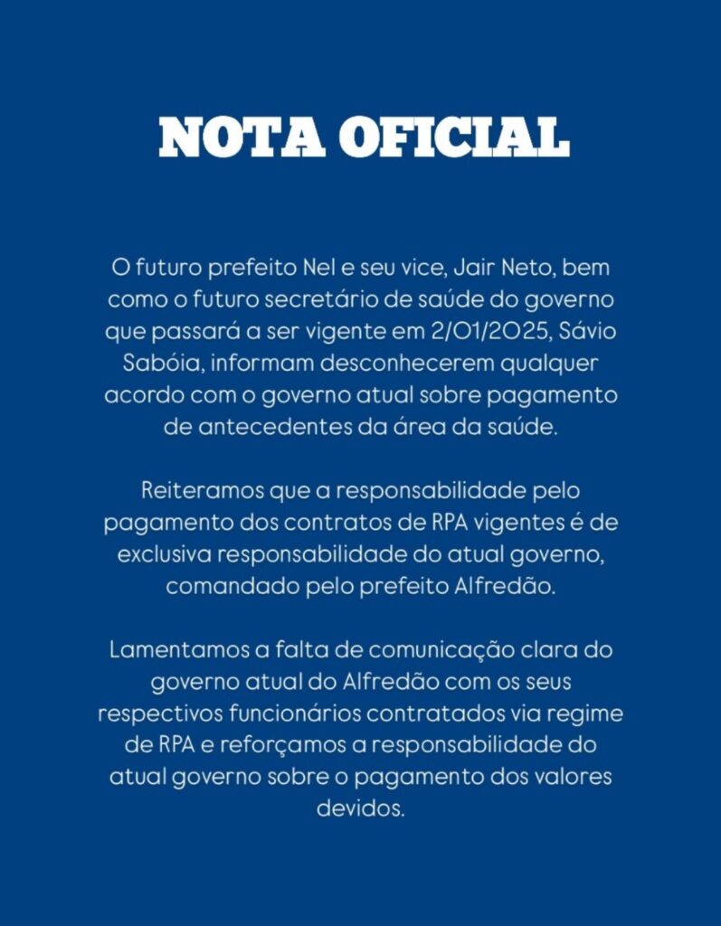 Na nota a equipe do futuro governo também lamenta a ausência de uma comunicação clara entre a atual gestão e os funcionários contratados pelo regime de Recibo de Pagamento Autônomo (RPA). Segundo o comunicado, o pagamento dos valores pendentes de contratos vigentes deve ser honrado pela administração de Alfredão, que permanece no cargo até 31 de dezembro de 2024. “Reforçamos que a transição não inclui assumir dívidas ou pendências desta natureza“, afirmou o prefeito eleito.